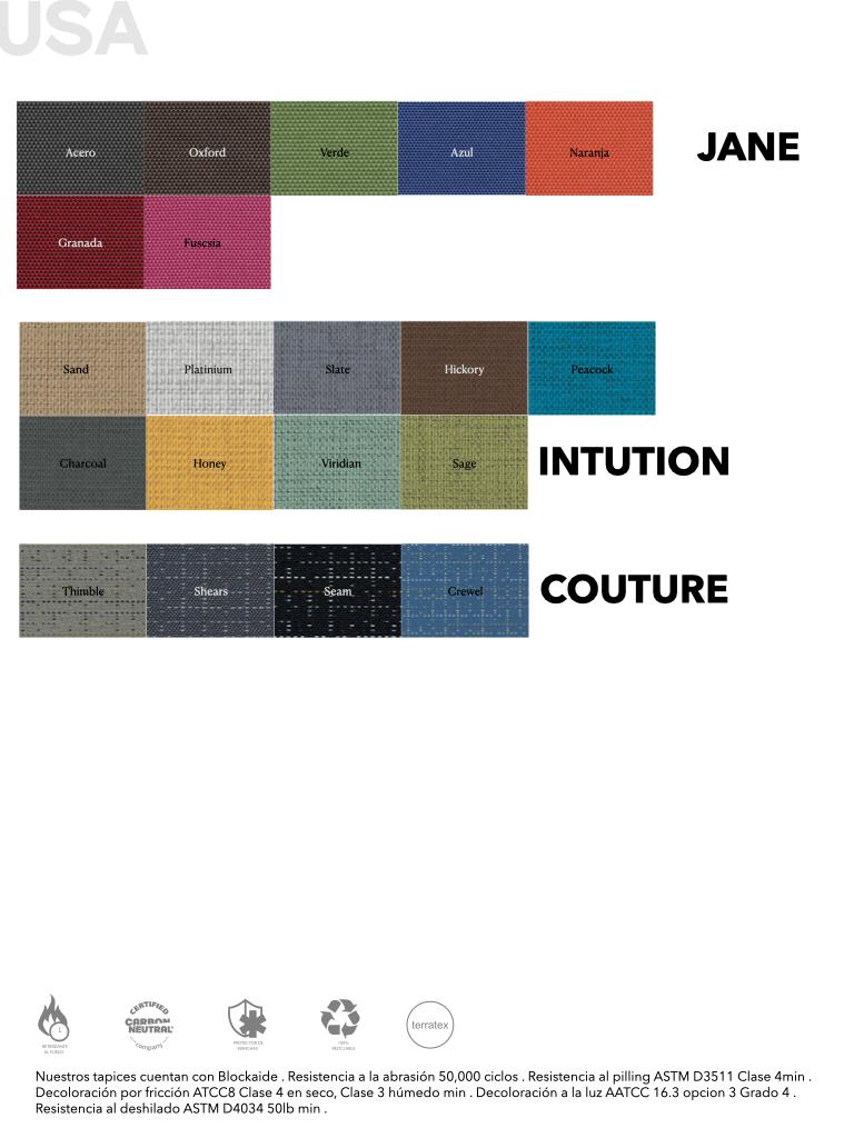 El cuerpo de este sillón esta fabricado en poliuretano inyectado en frio, con estructura de acero y bordes en madera. Los tapices son previamente seleccionados, donde el valor agregado son los ciclos a la abrasión con los que cuentan, que van desde los 35,000 a los 100,000 ciclos.