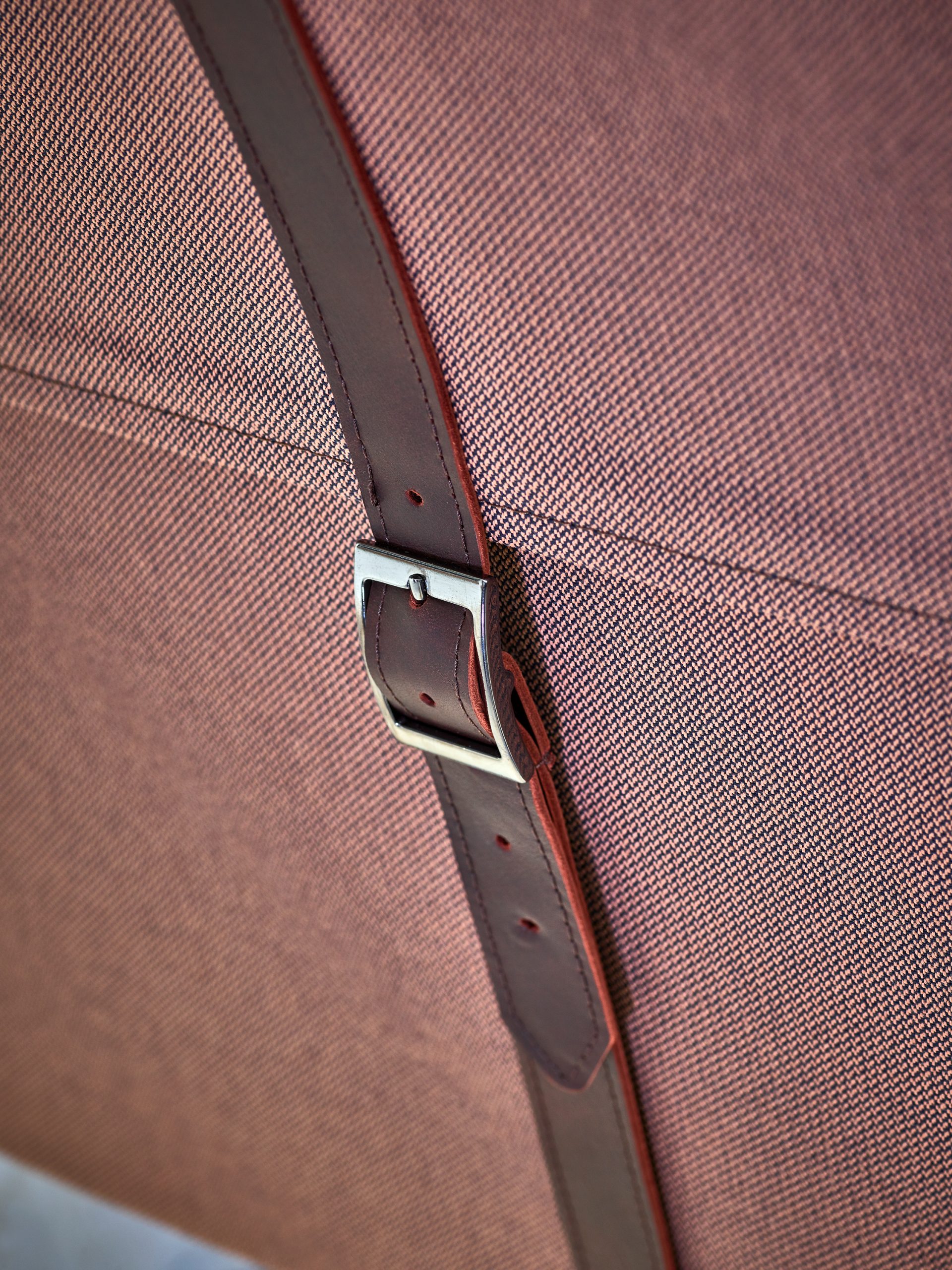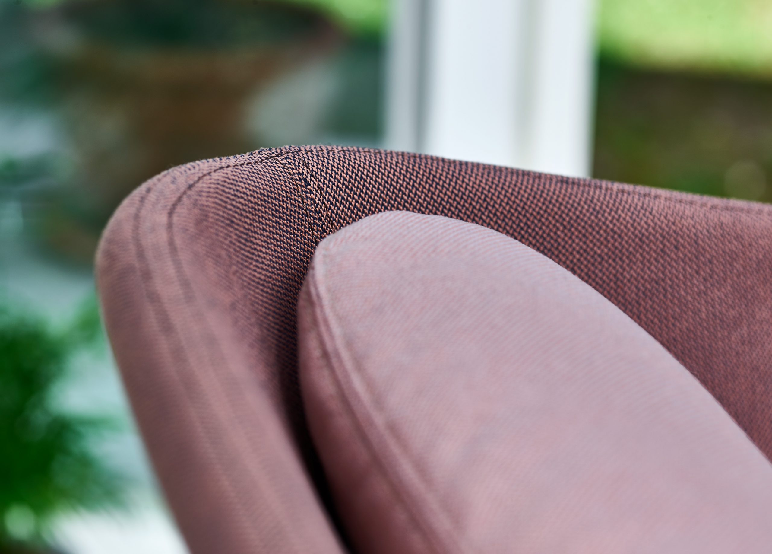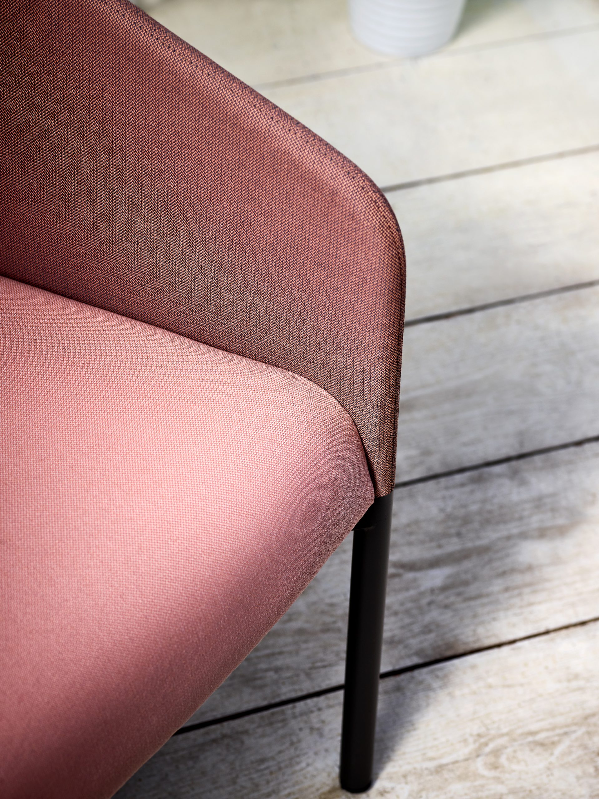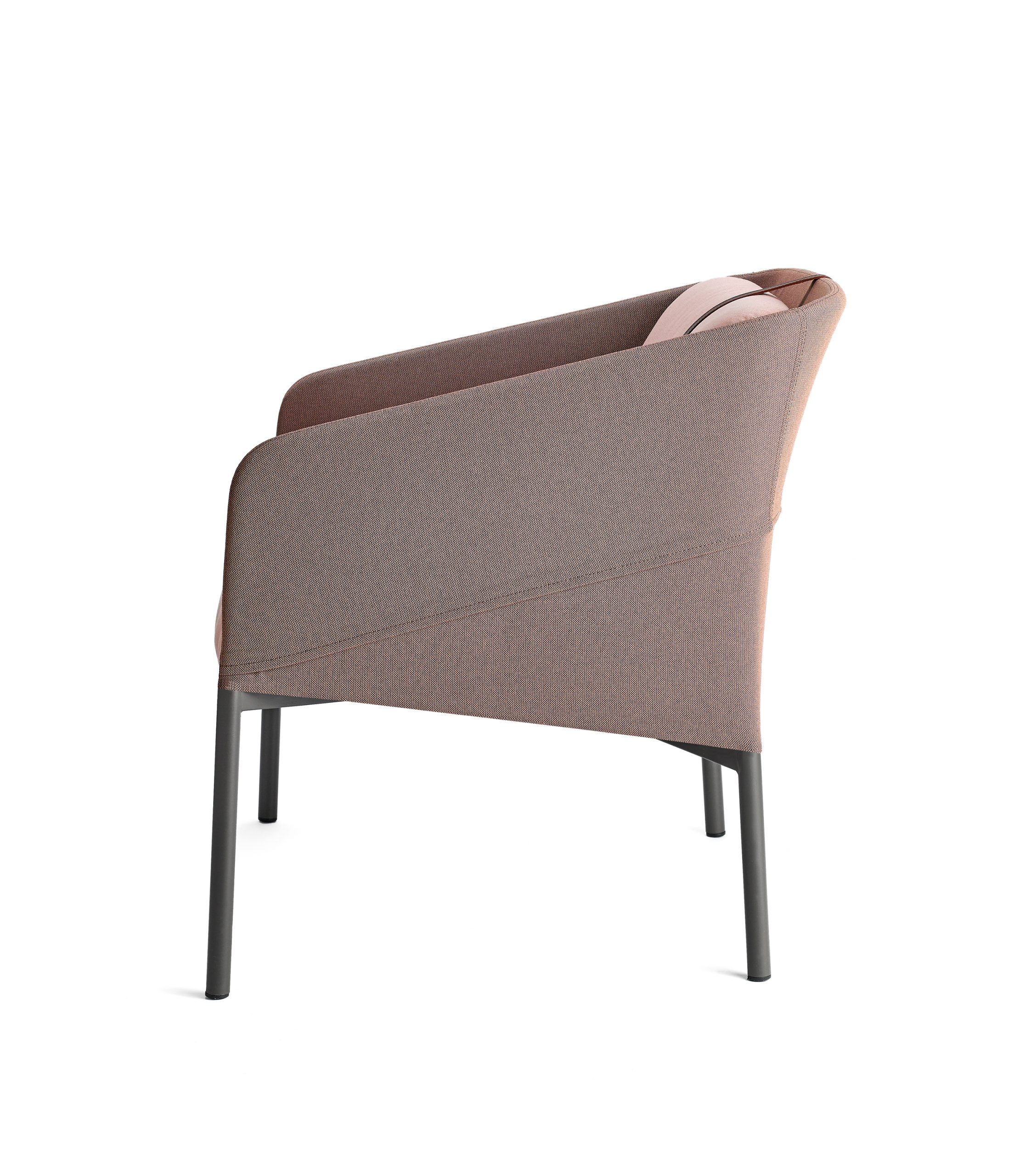 Demoiselle es un sillón y un sofá. Su revestimiento se trata como un vestido que combina diferentes estilos de tejido y cuero La estructura no está «cubierta» sino «vestida». Un cinturón fino une el cojín y el respaldo, haciendo referencia a un complemento de moda.