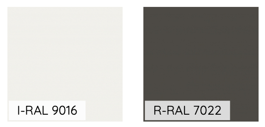 2 tonos de pintura para las bases y elementos metálicos: Ral9016 blanco y Ral7022 gris antracita.