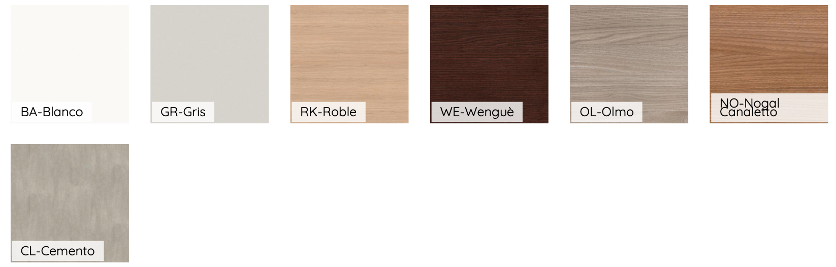 7 acabados a elegir para las cubiertas : blanco y gris solido, melaninas tecnológicas en madera de roble, wengé, olmo, nogal y cemento, como material pétreo.