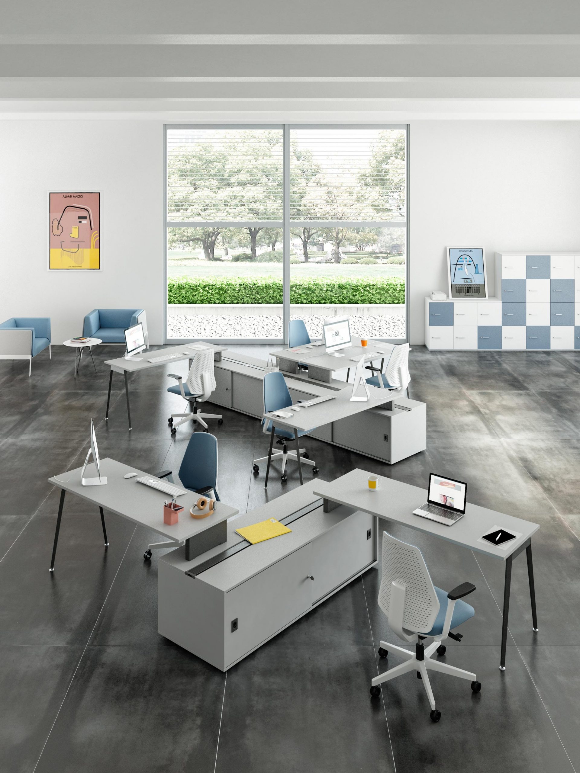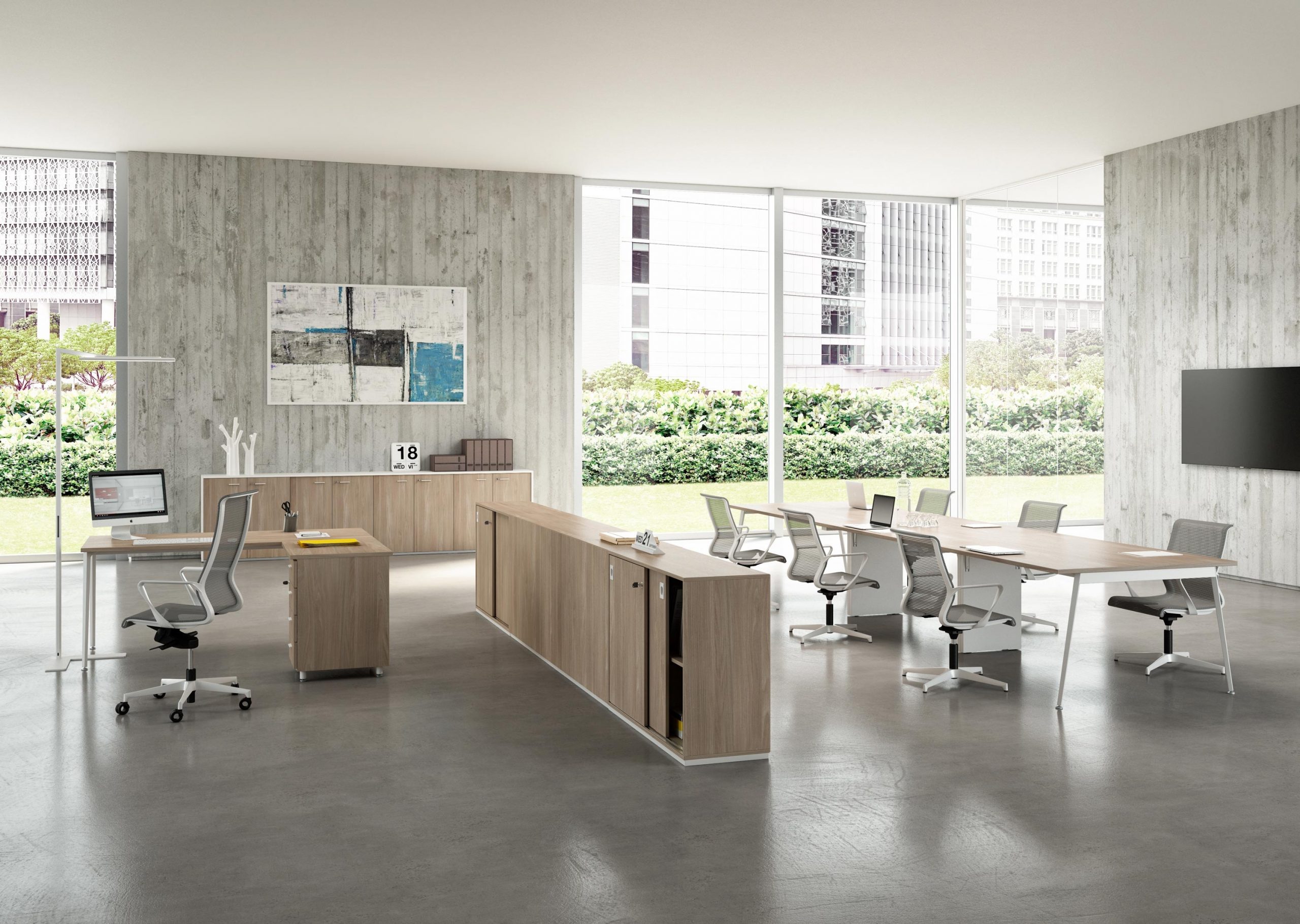 La colección incluye, escritorios, estaciones tipo bench, mesas para sala de juntas, pedestales fijos y móviles, archiveros y libreros con puertas corredizas. Una colección que cubre cualquier necesidad de amueblado en un espacio de oficina.