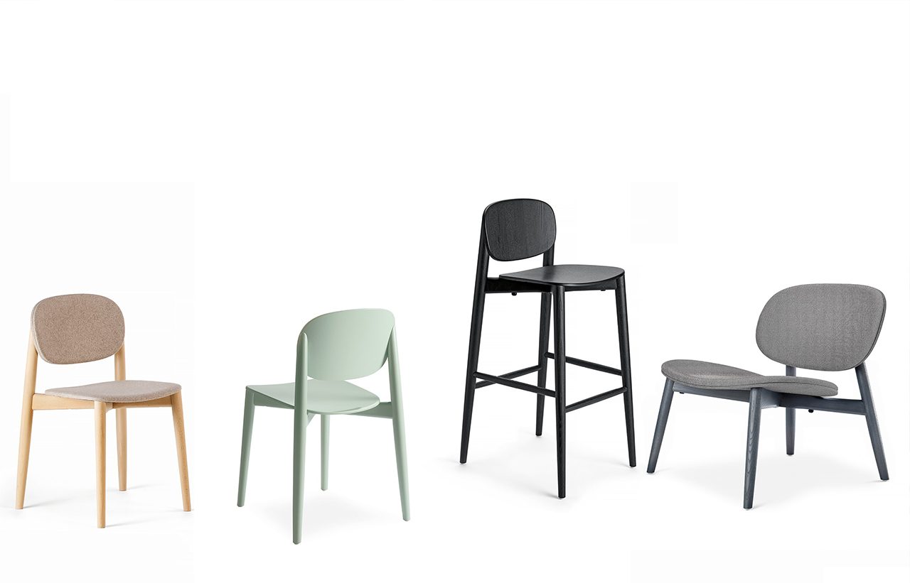 La colección consta de : silla , bancos en dos alturas y el sillón Lounge en madera o con la opción a tapizar asiento y respaldo.