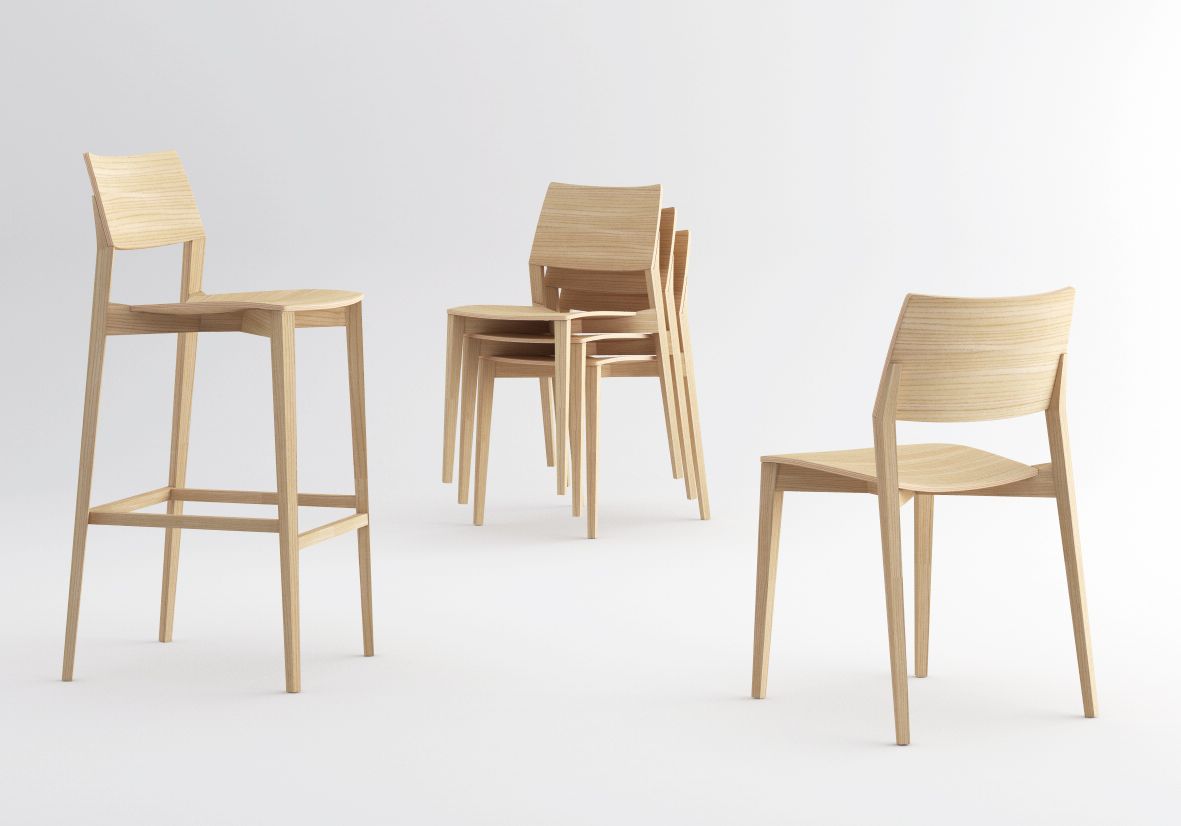 El cuerpo de la silla esta hecho de madera contrachapada que descansa sobre un marco de madera maciza, elaborado en roble o haya. Ligno es un producto adaptable, disponible en versión de silla y banco con posibilidad de asiento tapizado para mayor comodidad.