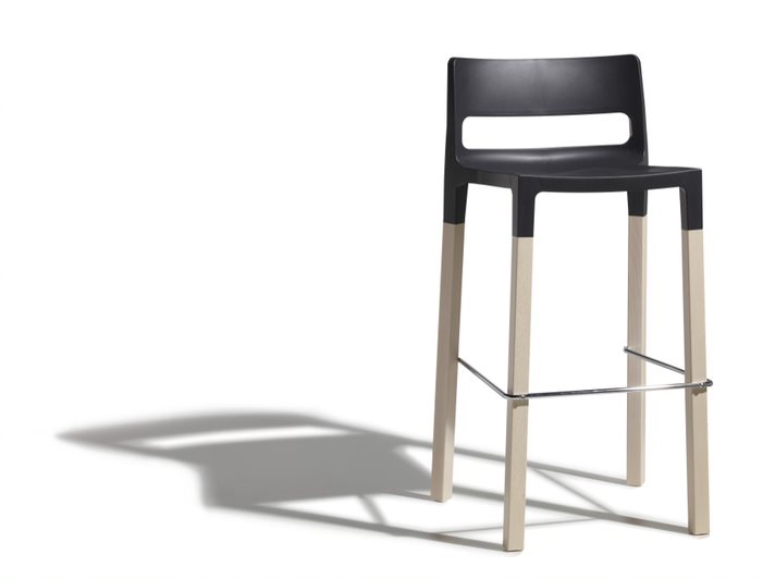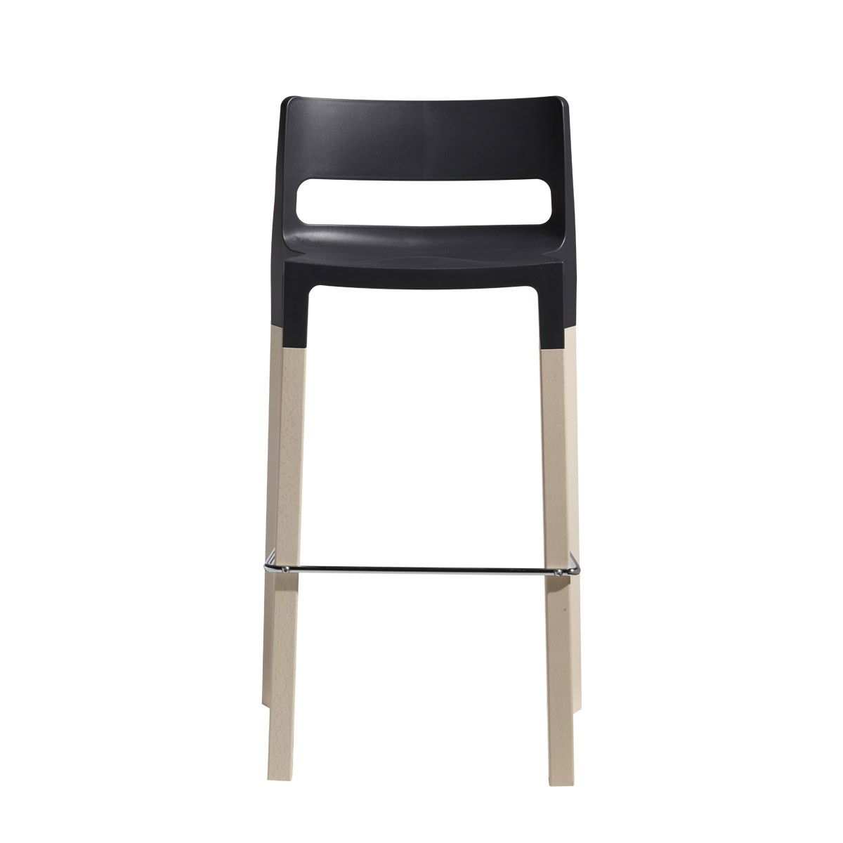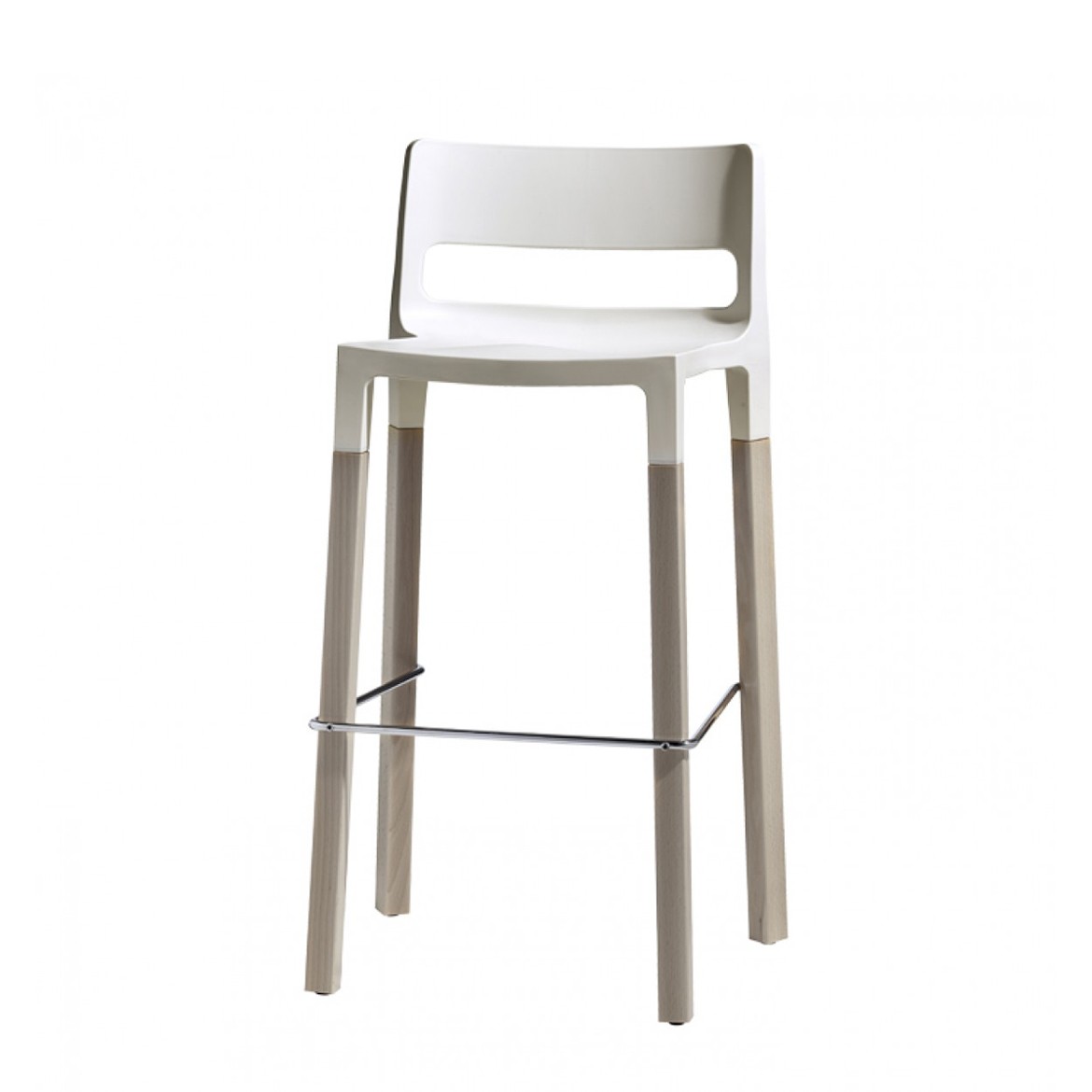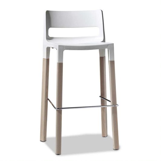 Natural Divo es un banco con asiento en tecnopolímero reciclable, reforzado con fibra de vidrio. La base es de 4 patas de madera de 35 mm X 35 mm en haya natural, con descansa pies tubular cromado.