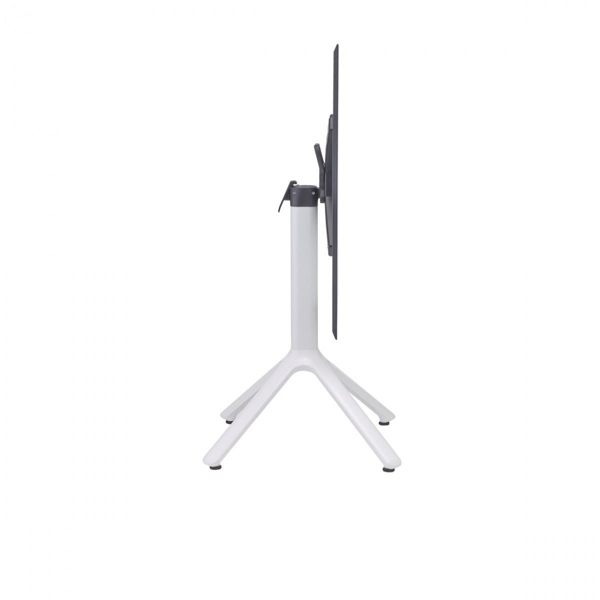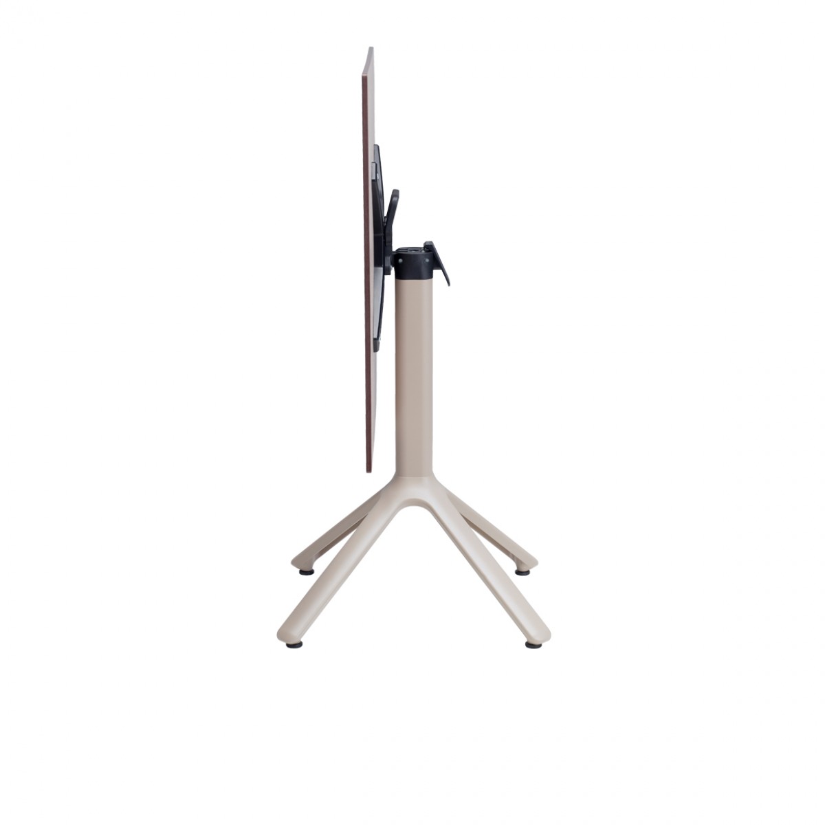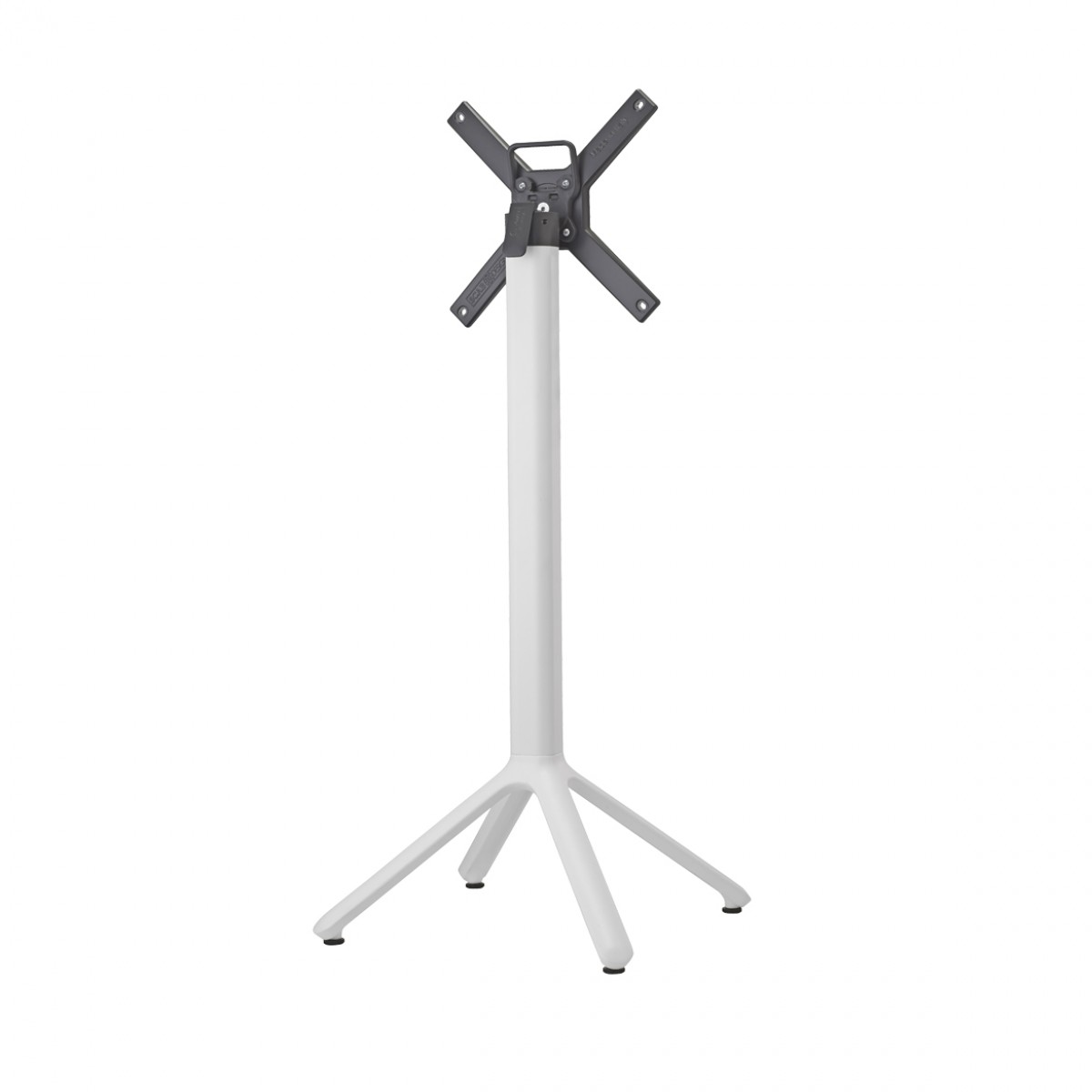 Base de cuatro puntos en aluminio fundido a presión, la columna cuadrada es de aluminio con esquinas redondeadas, con soportes de aluminio fundido en la parte superior para fijación de la cubierta. Cuenta con 4 regatones ajustables.