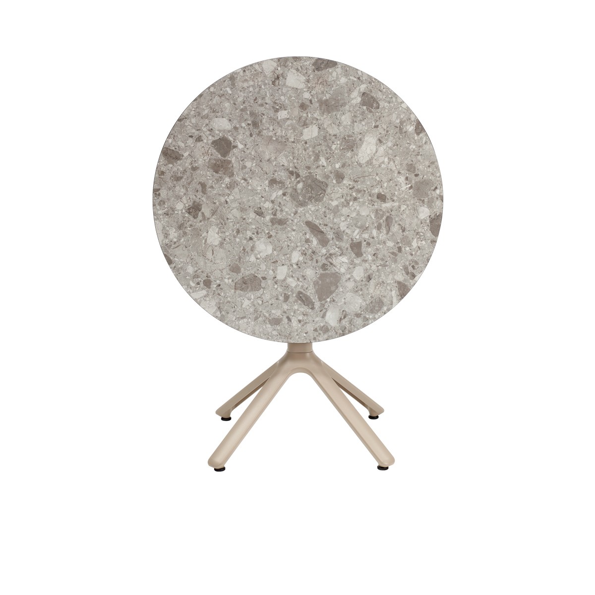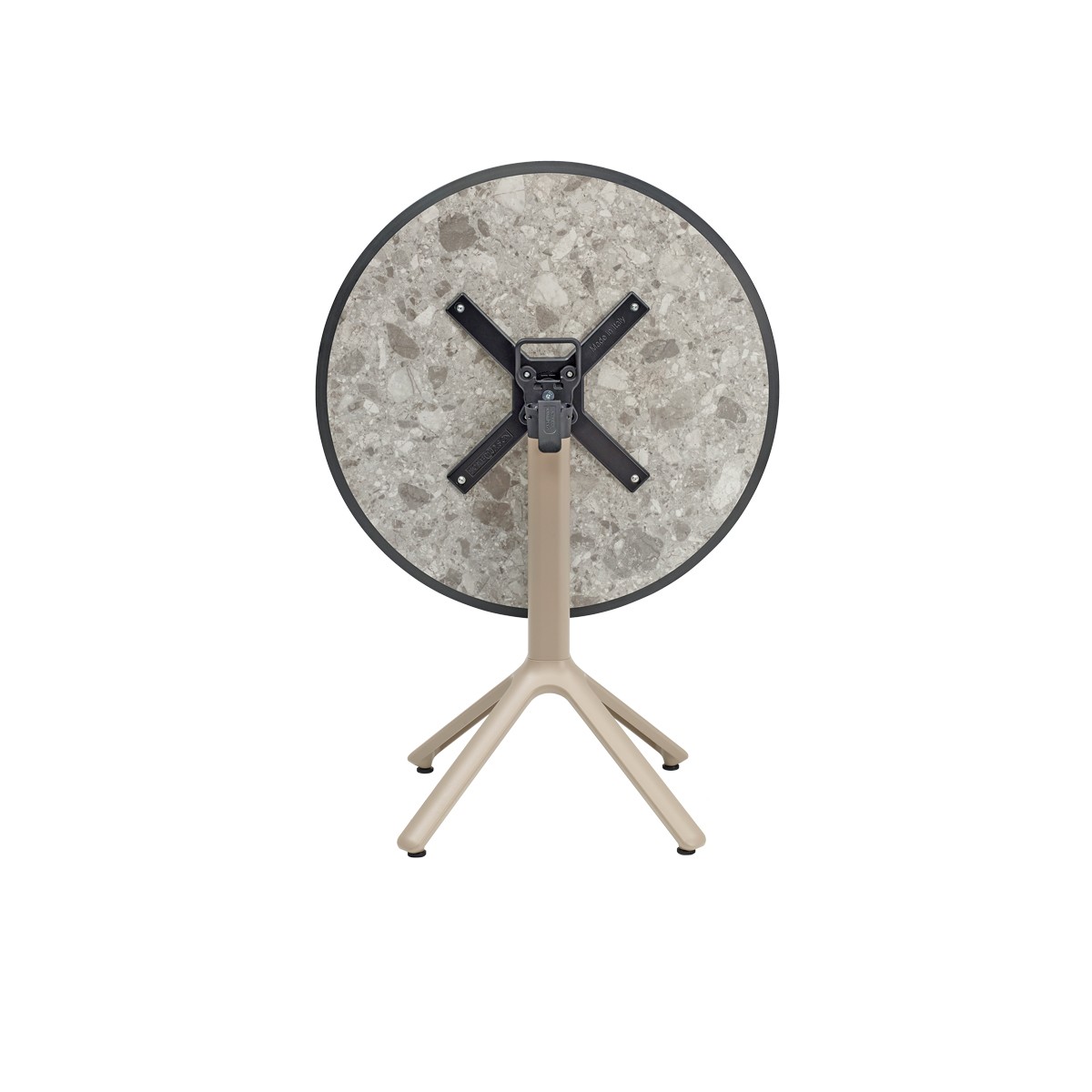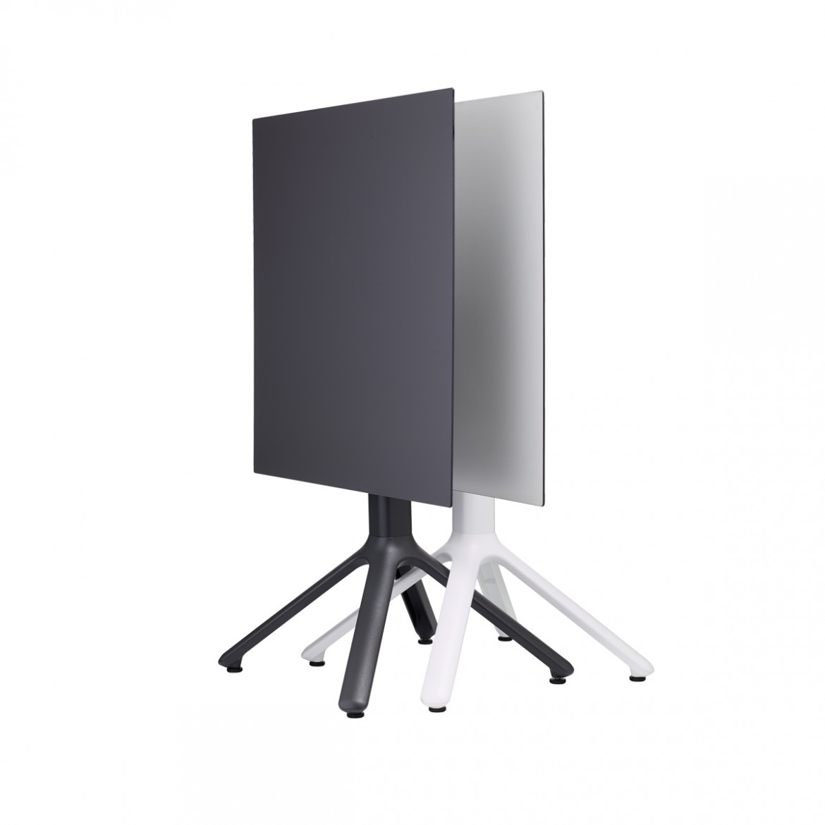 Base de cuatro puntos en aluminio fundido a presión, la columna cuadrada es de aluminio con esquinas redondeadas, con soportes de aluminio fundido en la parte superior para fijación de la cubierta. Cuenta con 4 regatones ajustables.