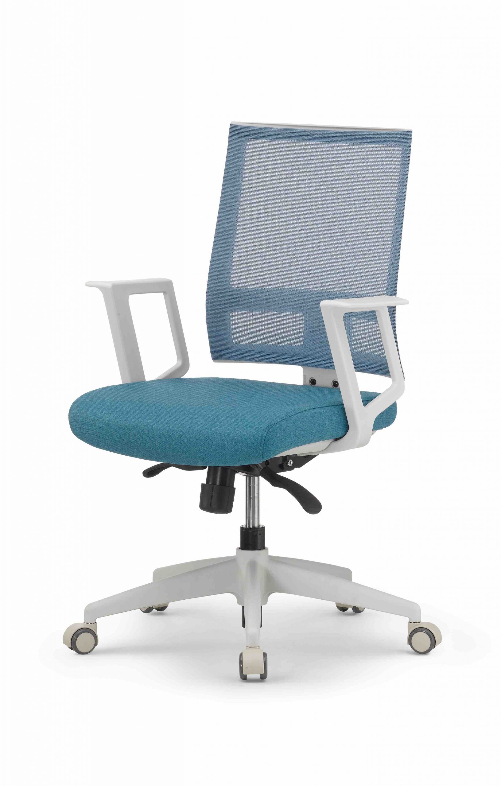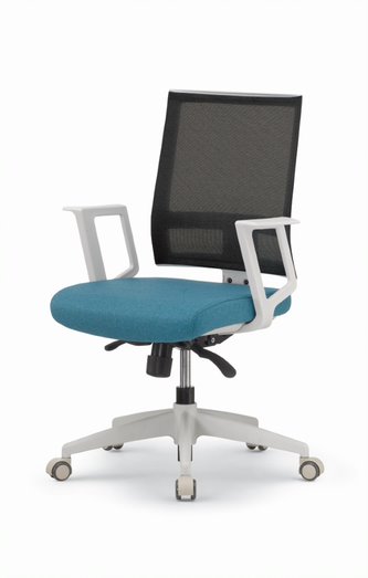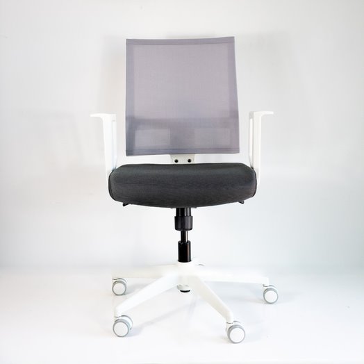 Respaldo en mesh en color: verde, azul, gris o negro. Con reclinamiento de contacto permanente y diferentes posiciones de bloqueo. Asiento con espuma de inyección. Brazos fijos y estructura en poliamida y nylon color blanco mate. Ruedas duales de poliuretano para pisos suaves (alfombra o duela) y pisos duros (piedras o porcelanatos).