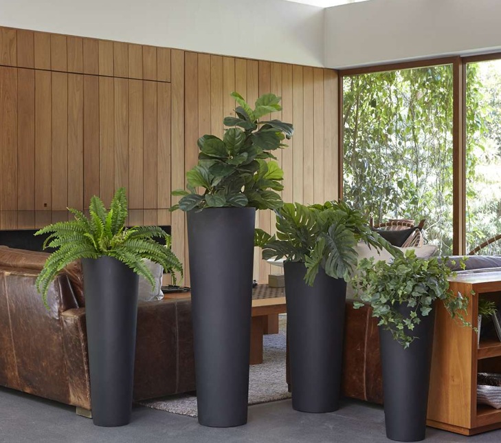 La maceta Paleto de figura esbelta cabe en cualquier lugar, pensada en lugares donde el espacio es un tema a cuidar. Cuatro tamaños diferentes.