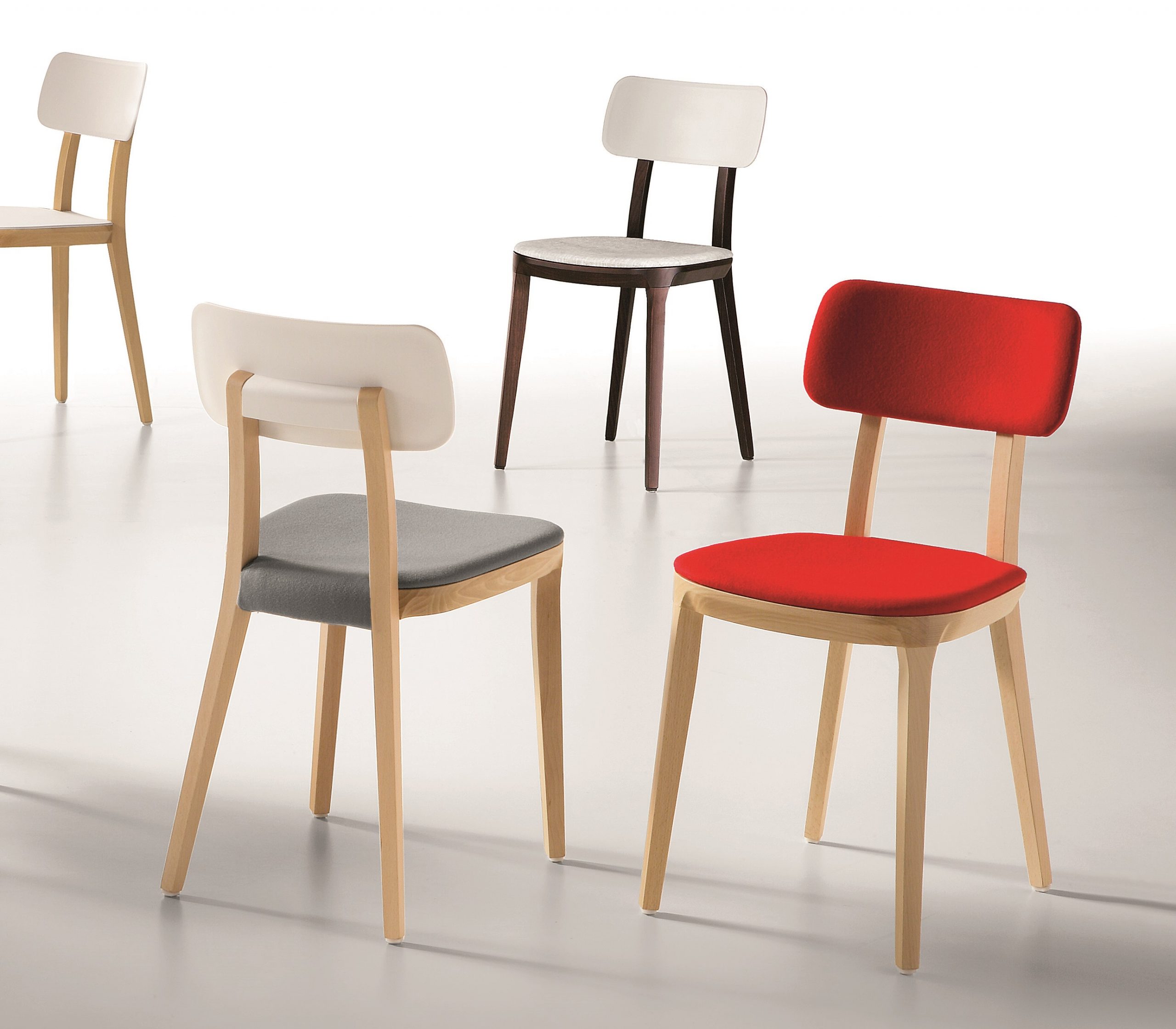 5 colores a elegir para respaldo y asiento : blanco, gris, tabaco, rojo o amarillo. Bases disponibles en haya natural o wengé.