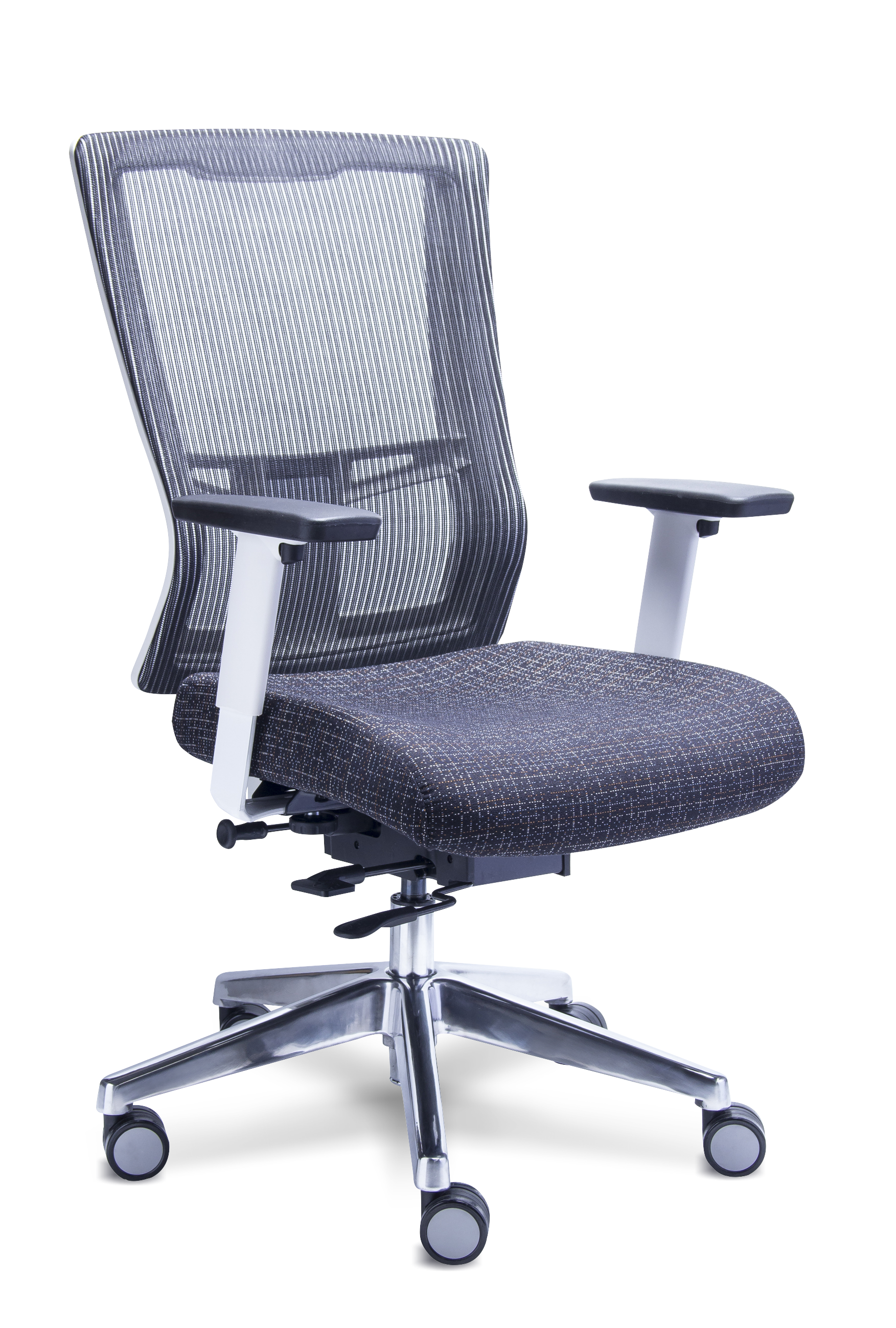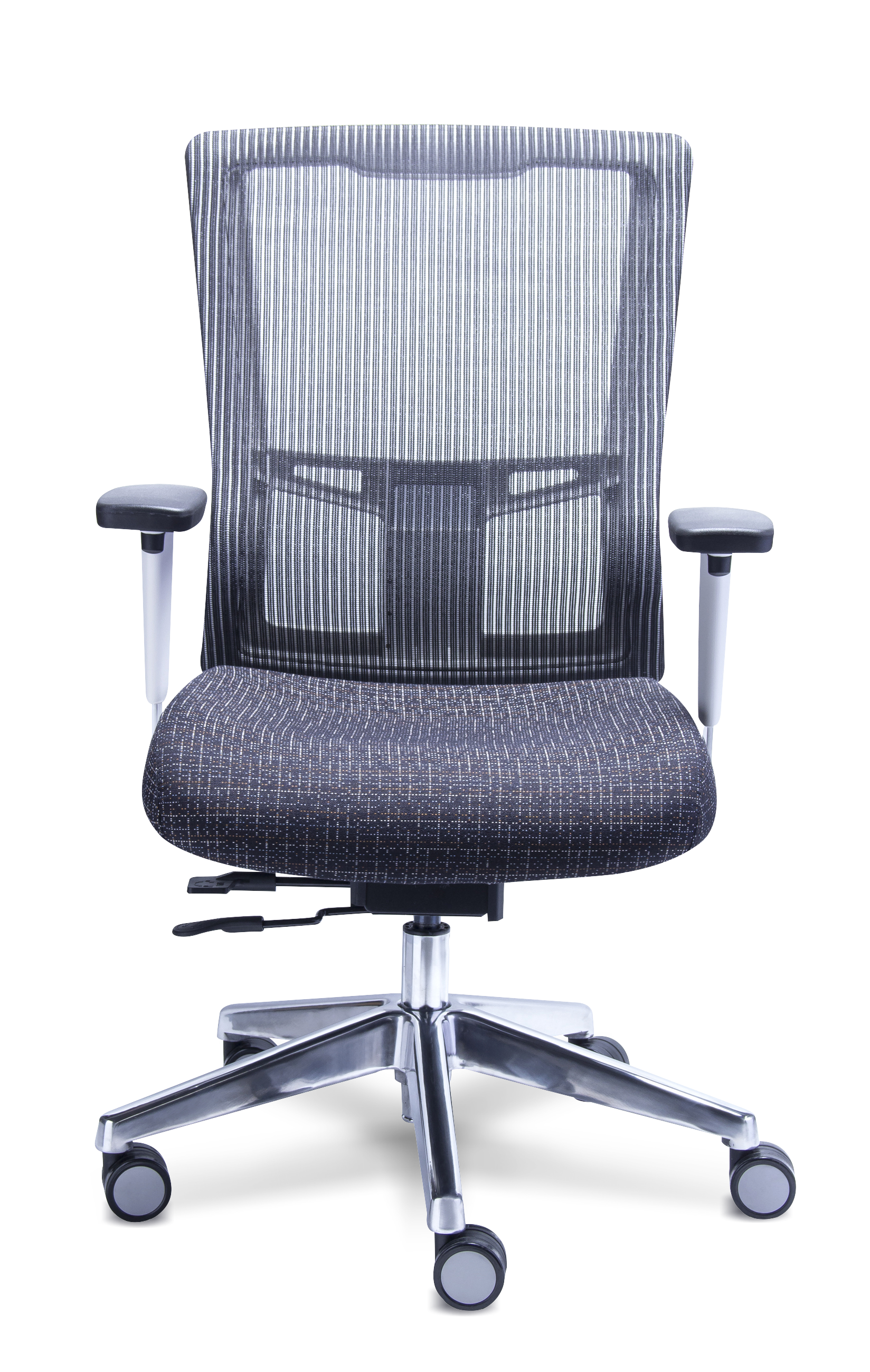 Las cualidades de la silla Quadra son: respaldo en mesh de nylon en color negro, blanco, verde o azul, asiento personalizado por los más de 30 tapices a elegir, descansa brazos ajustables en poliuretano negro y base de 5 puntas en aluminio pulido.
