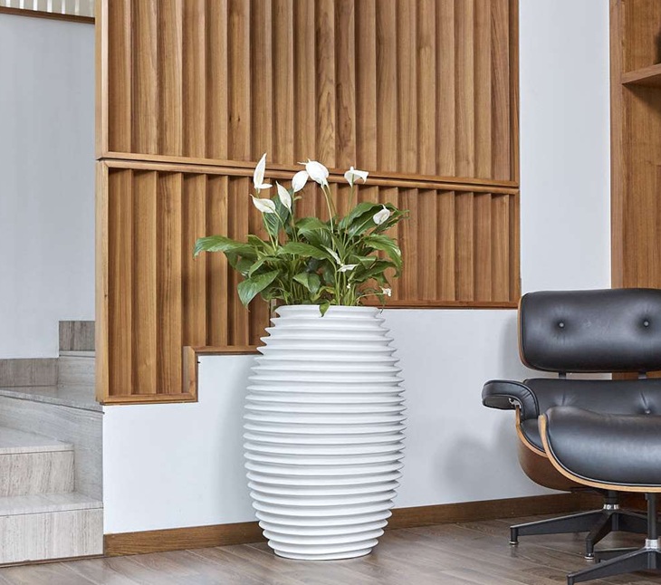 Una maceta con diseño singular, su terminado satinado y anillos al rededor logra un concepto original fino y elegante, puede decorar cualquier espacio.