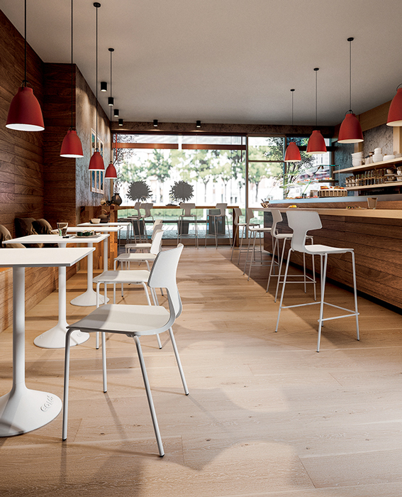 La colección es diseñada por Francesco Meda, quien selecciono 6 modelos de base a elegir : acero cromado o pintado, madera solida y polímero co-inyectado, en la versión de silla. En la versión de banco las opciones de base son únicamente en acero pintado o cromado.