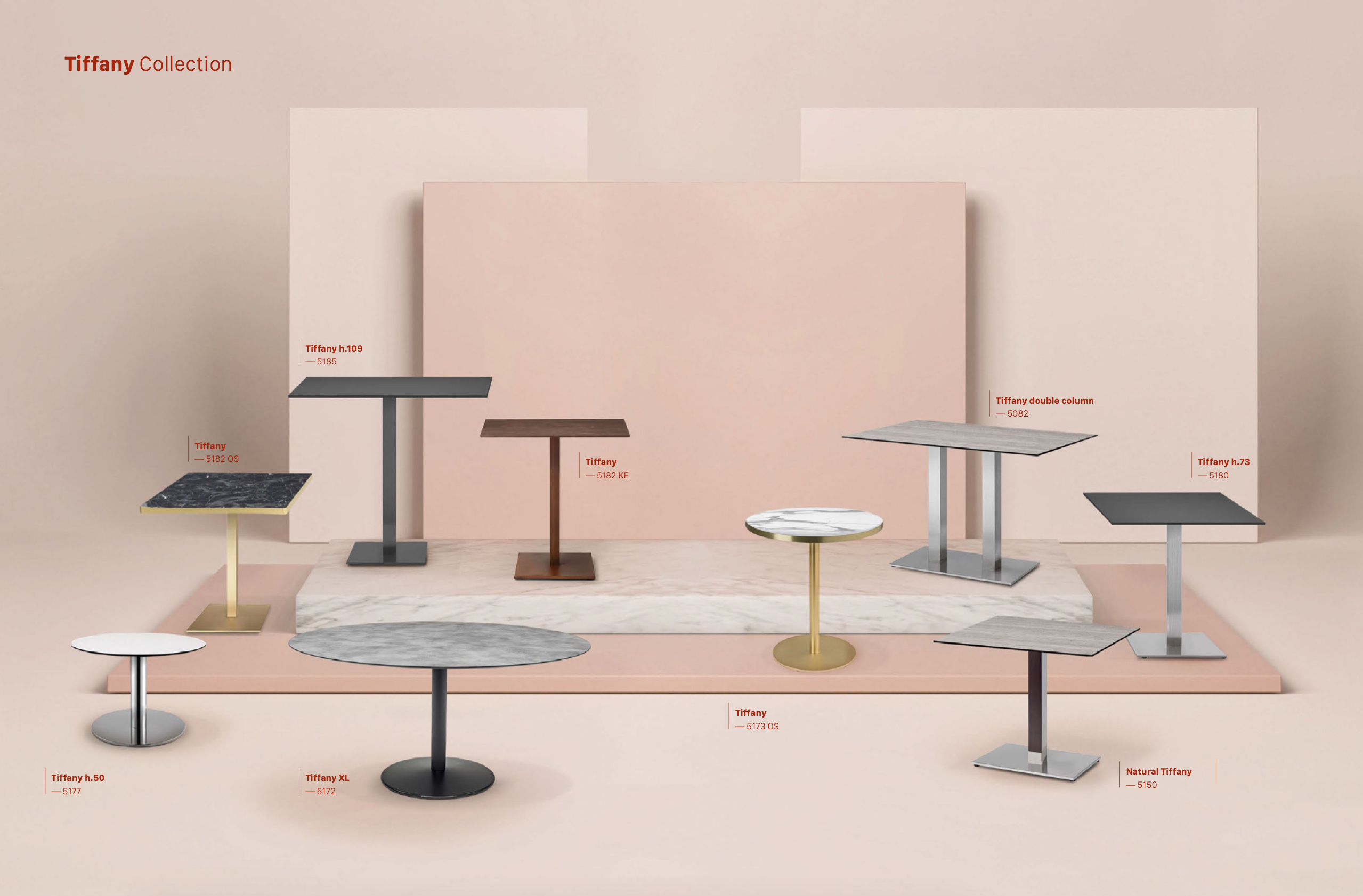 Tiffany es una colección de bases para mesa diseñada para cumplir cualquier necesidad de uso, estilo o espacio. Algunos de sus acabados son : acero satinado y efecto latón, acero pintado negro o efecto corten y pintura para uso exterior. Restaurantes y Hospitalidad es el tipo de proyectos donde se ha especificado en múltiples ocasiones.