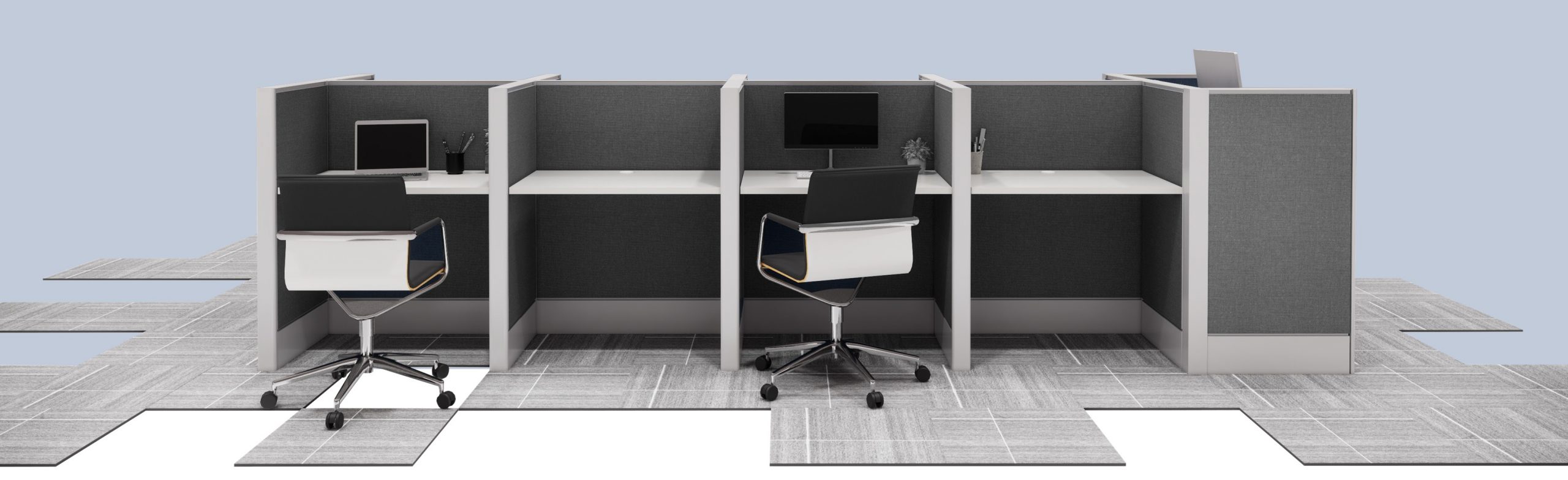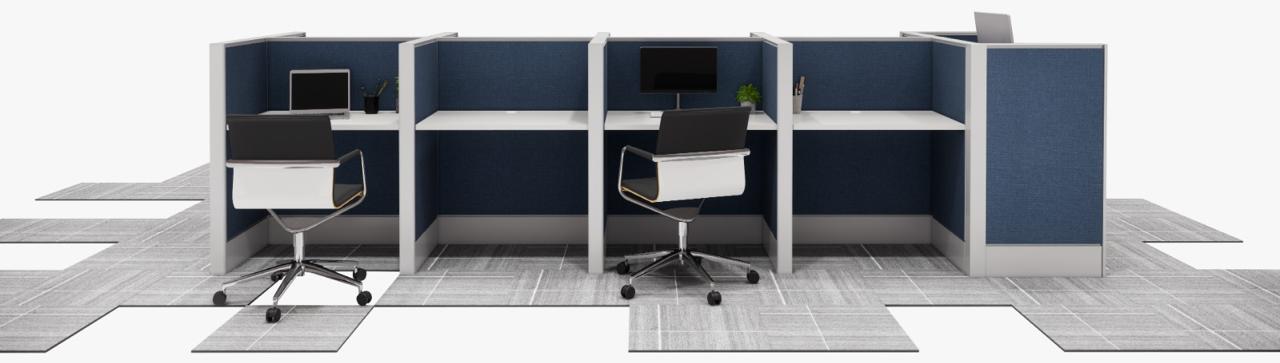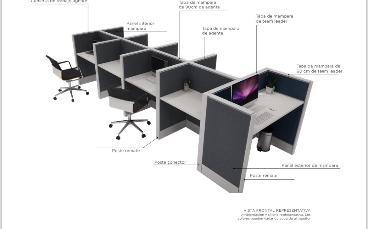 Estaciones diseñada para minimizar la sonoridad contigua de los colaboradores, cuentan con estructura metálica y paneles frontales y laterales acústicos forrados en tela, cubierta de 28 mm terminados en melamina o laminado con cantos de PVC termofusionados y saque para paso de cableado fijados por medio de ménsulas que se ajustan a la estructura, cuentan con espacio interior de 8.5 cm útiles para la correcta instalación de cableado de voz y datos así como electrificación.